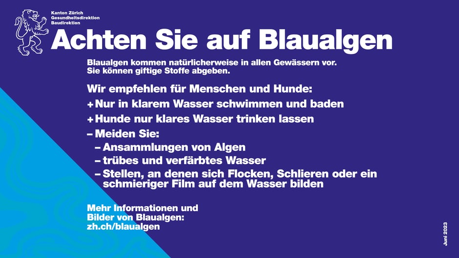 Weil sich die Blaualgen-Situation innerhalb kurzer Zeit ändern kann, ist es wichtig, dass die Hundehaltenden die Situation beurteilen und einschätzen können. Deshalb haben die Gesundheits- und die Baudirektion Verhaltensempfehlungen erarbeitet. Diese sind auf der Website zh.ch/blaualgen abrufbar.
